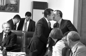 "Приходим на Кабмин, чтобы целовать красивых женщин, — говорит перед началом заседания правительства 56-летний Владимир Яловой, заместитель руководителя аппарата Верховной Рады. В знак приветствия целует в щеку народную депутатку от Партии регионов 36-летнюю Елену Бондаренко. Она курирует информационное направление работы Кабмина.