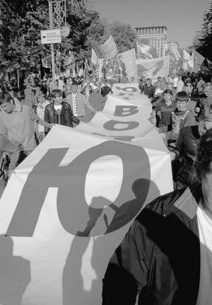 15 мужчин несут по столичной ул. Институтской белый 20-метровый плакат. На нем красным написано: "Юле – волю!" Вслед по проезжей части идут около 500 человек. Большинство из них держат флаги "Батьківщини". Во вторник утром они направляются к Высшему специализированному суду. Здесь должны продолжить рассмотрение кассационной жалобы экс-премьера Юлии Тимошенко на приговор по "газовому делу". Митингующих сопровождают несколько десятков милиционеров.