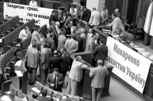 После его выступления БЮТ и НУ-НС просят получасовый перерыв. К трибуне подходят около 20 бютовцев. Стульями подпирают вход в президиум. Развешивают над правительственной ложей плакаты: "Свободу патриоту Макаренко", над президиумом - "Янукович + Фирташ + Хорошковский = газовая мафия".