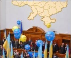 Перед вечерним заседанием 12 февраля из сессионного зала Верховной Рады выносят воздушные шарики с надписью: "НАТО — нет". Их и украинские флаги принесли утром депутаты из "Регионов", которые вместе с коммунистами опять блокировали заседание.