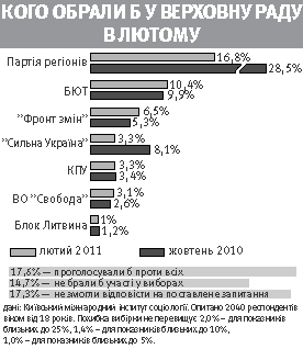 — Рейтинг падает, потому что Партия регионов несет ответственность за гречку, муку, тарифы и все другие "выкрутасы", — говорит 54-летний Вадим Карасев, директор Института глобальных стратегий. — Но не выполняет предвыборные обещания. Такие, как второй государственный русский язык. Партия регионов особенно после местных выборов начала терять статус символического представителя интересов Юга и Востока страны. Чем больше она становится партией власти, тем меньше рассматривается как представитель интересов граждан этих областей. Рейтинг будет падать до уровня определенного электорального ядра. Оно при любых условиях будет голосовать за Партию регионов. Это 15 процентов. "Регионалам" нужно проводить понятную для населения политику, работать на интересы людей, а не олигархов. Разве народ не видит, кто выиграл от победы Партии регионов на президентских выборах? Выиграли не люди, не жители Донбасса или Юга Украины, а определенная группа людей.