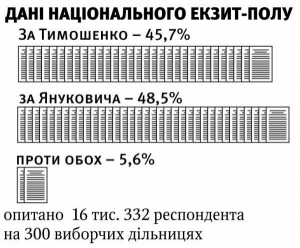 Наименьший разрыв между кандидатами в президенты прогнозирует национальный экзит-пол — 2,8%. За Тимошенко — 45,7%; за Януковича — 48,5%; против обоих — 5,6%. Опросили 16 тыс. 332 человека на 300 избирательных участках. Хотя во время первого тура национальный экзит-пол оказался единственным, кто ошибся. Прогнозировал разрыв между Тимошенко и Януковичем 4,2%. Но, по данным ЦИК, этот показатель в первом туре достиг 10,27%.