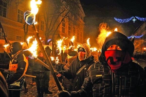 Привозят около тысячи факелов. Просят людей заплатить, кто сколько может. Самое малое — 2 грн. На палку намотанные пропитанные бензином лохмотья. Люди дают по 5, 10 грн. Зажигают их, идут по улицам с возгласами: "Круты! Круты! Вас не забыть!", "Шухевич, Бандера — герои Украины!", "Украина! Молодежь! Революция!", "Слава Украине! Слава нации!"