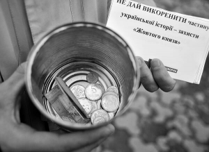 — Мы здесь акцию проводим "Пожертвуй 5 копеек на книгу Табачнику", — объясняет 22-летний Максим Юсупов, член молодежного крыла партии "Украина Соборная". — Наш любимый министр хочет искоренить из нашего сознания память о Голодоморе. Мы против этого. Собираем деньги министру на книгу. Пусть ее перечитает и поймет, что такое забыть невозможно.