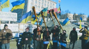 — Посмотри на его глаза, да он не понимает, кто к ним подошел, — 5 февраля высокий парень в измазанном сажей бушлате тычет пальцем в строй солдат на столичной ул. Грушевского. В 4 м от них поднимают 3-метровые трембиты четверо гуцулов и начинают играть. Часть солдат с любопытством смотрят на них, остальные прячутся за щиты. Громкий звук заглушает советские песни, которые крутят позади кордона.