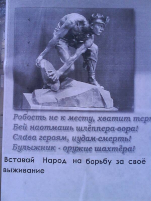 Центр Донецка обклеили полсотней листовок с призывом бороться против действующей власти. Первые появились 5 января. На них фотография скульптуры Ивана Шадра "Булыжник — оружие пролетариата". Изображен горняк, который поднимает тяжелый камень. Внизу подпись "Вставай народ на борьбу за свое выживание".