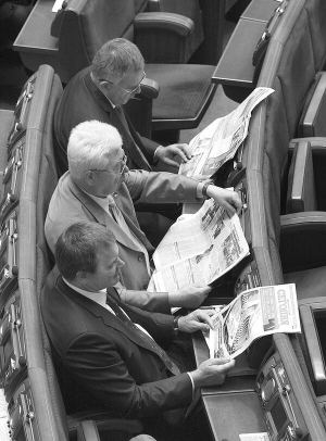 В сессионном зале 15 "бютовцев" из 105. Читают газеты, законопроекты. Остальные — в Печерском суде вместе с Тимошенко. "Регионал" Владимир Ландик на портативном компьютере "айпед" просматривает интернет-страницы с продажей машин.
