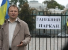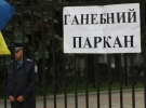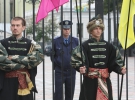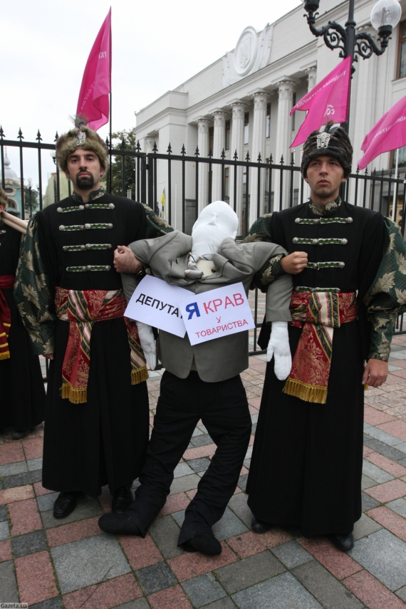 В 11.00 двое мужчин в черных казацких кафтанах привлекли к забору, который окружает парламент, большую куклу. На ней - светлый пиджак, брюки и черные носки и на шею прикреплены два листа: "Депутат" и "Я воровал у общества".