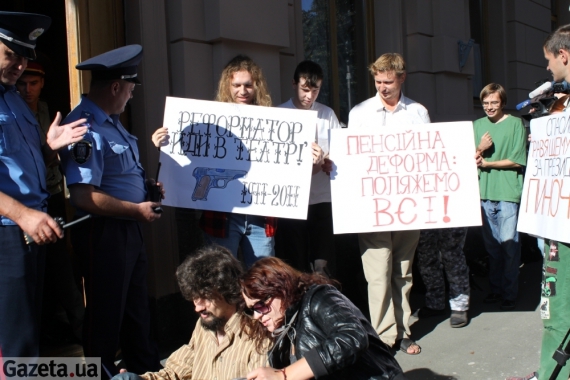 Несколько активистов, которые стояли у входа в здание комитетов ВР, держали транспаранты: "Реформатор, иди в театр", "Спасибо правящему классу за президента Пиночета", "Пенсионная деформа: ляжем все!".