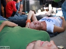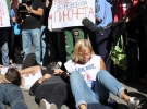 Лежа, митингующие выкрикивали: "Депутатов на заводы, пусть работают уроды!", "Выйди на улицу, потому что не выйдешь на пенсию!", "Одно решение - сопротивление", "Депутаты-паразиты не дают нам свободно жить".