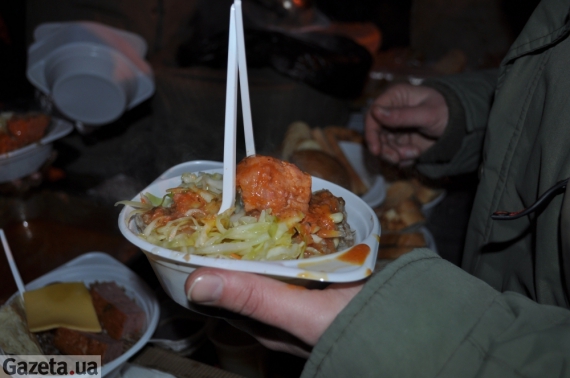 Кроме бутербродов, протестующих угощают картошкой в мундирах, салом, бужениной, мясной нарезкой, супом, борщом, тефтелями и гарниром из каш. Из фруктов дают яблоки, мандарины и бананы.