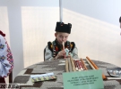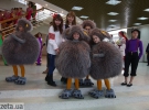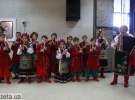 В холле на первом этаже расставлены круглые столики. На них вышивки, картинки, скульптуры из глины. Полукругом сидят десять бандуристов. Полсотни детей в костюмах кроликов, Буратино и белых медведей проводят репетицию. Из динамиков раздается танцевальная громкая музыка. Перед парадным входом - рамка. У нее четверо охранников.