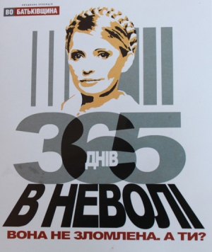 Также в этот день во всех районах Киева появились стикеры с изображением Тимошенко "365 дней в неволе. Она не сломлена, а ты?".