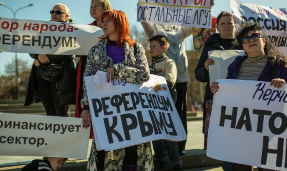 16 мая оккупационная власть провела "референдум", на котором за присоединение к России проголосовали якобы более 96% населения полуострова. 18 мая Россия официально аннексировала Крым, де-факто присоединив полуостров. Ни одна страна мира не признала законность этого акта.