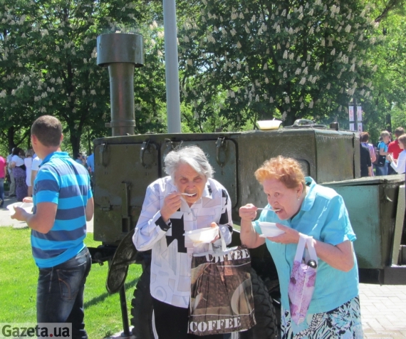 "Это священный день для каждого православного, - поделился с Gazeta.ua отец Виктор, священник УПЦ Московского патриархата, который пришел на праздник со всей семьей. – Господь через людей освободил землю православную и продлил жизнь на земле. На день Георгия Победоносца произошел перелом. Поэтому это наш православный праздник. И сегодня во всех церквях служатся благодарственные молебны – благодарения людям, которые принесли победу. И Богу. А панихиды перенесли на Радоницу – на ближайшее воскресенье".