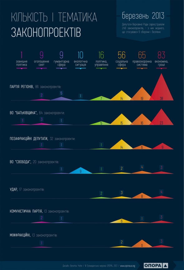 В марте 2013 года депутаты фракции Партии регионов зарегистрировали 86 проектов законов и постановлений разного направления. На втором месте ВО "Батькивщина", которая зарегистрировала 64 законопроекта. Март для "Свободы" и УДАРа оказался наиболее продуктивным месяцем в законотворчестве.