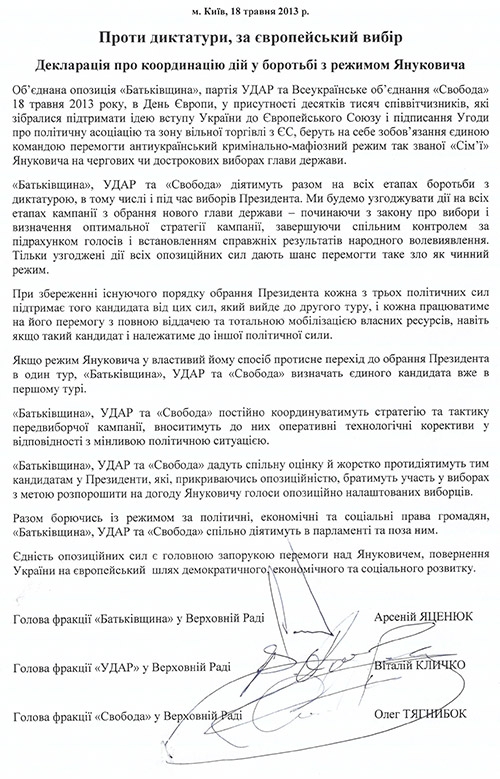 "Мы должны руководствоваться тем, о чем уже договорились три политические силы. Есть документ, подписанный 18 мая ( 2013 года - Gazeta.ua), и там стоит подпись Виталия Кличко, Олега Тягнибока и моя , где четко определено, что три политические силы договорились иметь единого кандидата во втором туре", - отметил Яценюк журналистам в четверг.