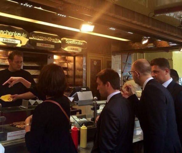 "Премьер-министр Украины и посол Украины в ФРГ (Павел Климкин, на фото - слева от Яценюка) покупают сосиски в кафе, Аахен, 29.05", - говорится в подписи к фотографии, размещенной в Twitter.