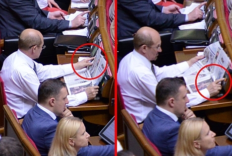 Во время часа вопросов к правительству Яценюк поднялся в ложу прессы, где одна из журналисток ему показала распечатки фото со вчерашнего заседания. На них зафиксированы все случаи "кнопкодавства", которые были замечены журналистами. Среди них было и несколько фото с народными депутатами от "Батькивщины".