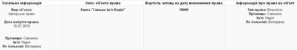 Среди нематериальных активов Савченко - книга "Сильне ім'я Надія". Ее стоимость оценили в 30 тыс. грн.