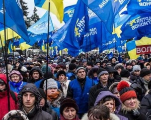 Сейчас там уже есть около тысячи человек. На митинг люди идут колоннами с табличками регионов и городов Украины .