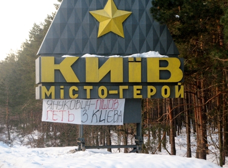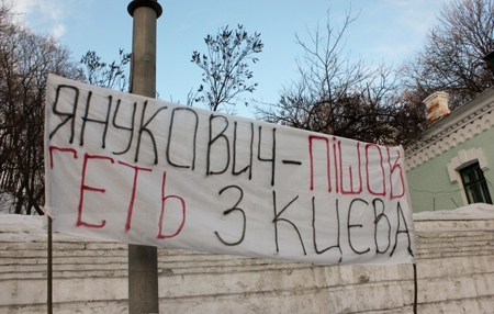 В среду дорогу Виктора Януковича из Межигорья на работу украсили транспарантами "Янукович, пошел вон из Киева!".