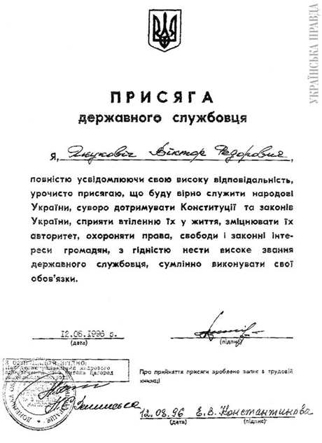 Журналист публикует присягу Януковича как государственного служащего, составленную им 12 августа 1996 года, когда его назначили заместителем губернатора Донецкой области.