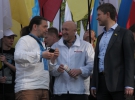 Когда приходят Арсений Яценюк и Олег Тягнибок толпа начинает скандировать "Тягнибок! Яценюк! Украина". Люди окружают их, чтобы слышать, что будут говорить.