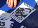 С крыши Печерского суда разбросали глянцевые бумажки в виде 200-гривневых купюр. На них надпись - "Тимошенко к ответственности!", и портрет Тимошенко вместо Леси Украинки.