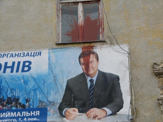 Хулиганы повредили два баннера на центральном офисе Партии регионов в Тернополе. Портреты президента Украины Виктора Януковича залили красной краской.