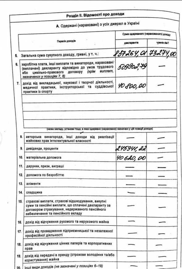 В ней сообщается, что его общая сумма дохода составляет 837 264 грн, доход от преподавательской, научной и творческой деятельности – 40 800 грн., заработная плата - почти 510 тысяч грн.