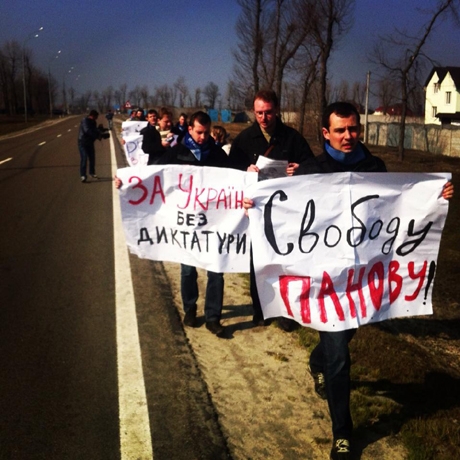 Около 20 активистов "Демократического альянса" прошли колонной к резиденции президента Виктора Януковича "Межиигря". Они прошлись от трассы в направлении резиденции. Держали в руках плакаты с надписями: "За Украину без диктатуры", "Свобода Панову".