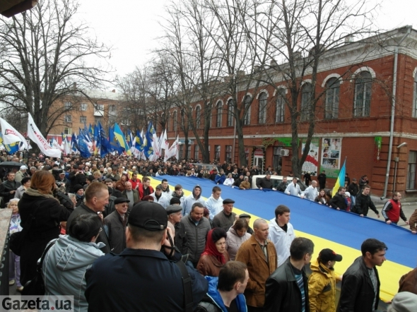 Колонна прошла по улице Ленина. Впереди нее митингующие несли сине-желтый флаг, которым перегородили всю дорогу. У театра имени Николая Гоголя колонна свернула, и остановилась на Театральной площади. Там смонтированной сцене выступили лидеры оппозиции, народные депутаты, представители оппозиционных областных штабов. Митинг длится около 2 часов.