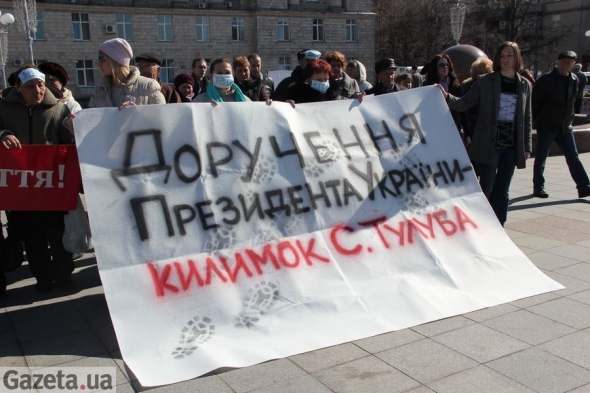 Около 30 больных с почечной недостаточностью провели акцию протеста под стенами облгосадминистрации. Митингующие развернули большое полотно с надписью "Поручения Президента Украины - коврик С.Тулуба", плакаты с надписью "Фрезениус - это жизнь". На лицо надели повязки с надписями "Инвалид первой группы". Они выступали за то, чтобы стало более доступным процедура "френзениус", которая является обязательной при их заболевании.