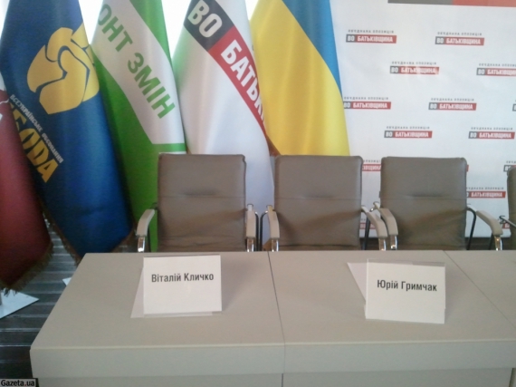 Несмотря на то, что на столе стояла табличка с фамилией лидера УДАРа Виталия Кличко, он так и не пришел.