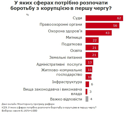 В первую очередь борьбу с коррупцией надо начать в судах - так считают 62% опрошенных. Затем в правоохранительных - 56%.