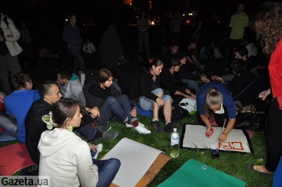В акции принимают участие преимущественно молодые люди. Ои рисуют плакаты и крепят их к забору возле ВР. Также зажгли две траурные свечи "в память" о мирных собраниях, которые, по их словам, завтра в парламенте уничтожат окончательно.