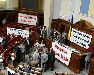 Также в сессионном зале размещены плакаты с надписями: "Свободу патриоту Макаренко!", "Янукович Фирташ Хорошковский = газовая мафия".