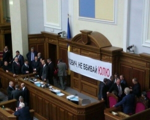 Бютовцы повесили в президиуме ВР плакат "Янукович, не убивай Юлю". На своих местах они разместили плакат "Нет - политическим репрессиям! Украине - свободу!" с изображением экс-премьера.