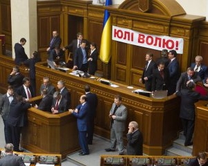 До начала заседания парламента депутаты заблокировали трибуну и президиум, вывесили плакат с надписью "Юле – свободу!".