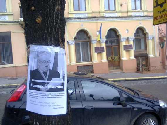 На стенах черновицких домов появились листовки, на которых изображен судья Апелляционного суда г. Сумы Николай Гончаров. Он подтвердил незаконный приговор Владимиру Никоненко и Игорю Ганненко за трафарет с "простреленным" Януковичем, сообщают в общественной организации "Черный комитет"