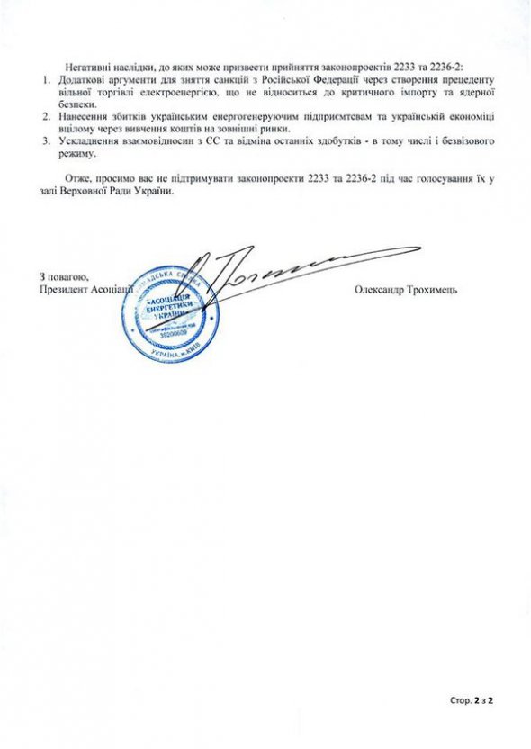 Трохимец подчеркнул, что введение таких норм в законодательство Украины грубо нарушает Соглашение об ассоциации Украины с ЕС в части энергетики. Ведь Украина обязалась имплементировать европейские нормы права в украинское законодательство. Таким образом, это может осложнить отношения Украины с ЕС и угрожает евроинтеграции, а также может повлечь снятие международных санкций из России. И призвал депутатов не поддерживать эти законопроекты при голосовании в Верховной Раде.