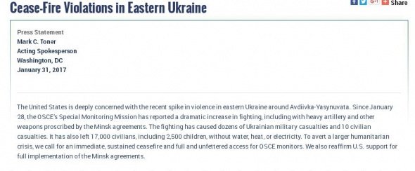 "Чтобы избежать большего гуманитарного кризиса, мы призываем к немедленному постоянному прекращению огня и полному беспрепятственному доступу наблюдателей ОБСЕ. США поддерживают полную имплементацию Минских соглашений", - сказано в сообщении.