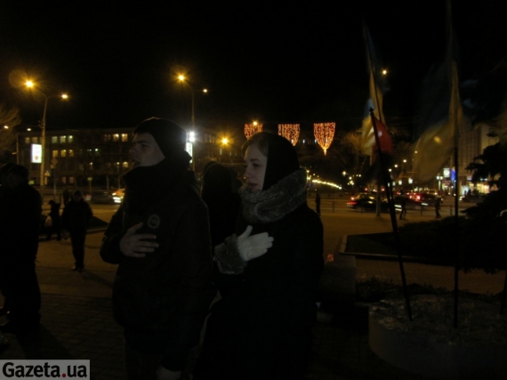 В пятницу вечером на донецком евромайдане собралось больше 200 человек. Участники акции протеста кроме национального гимна исполнили гимн Евросоюза. Затем координаторы представили собравшимся изготовленный на пожертвования флаг донецкого евромайдана. По предложению большинства приняли решение ехать в Киев.