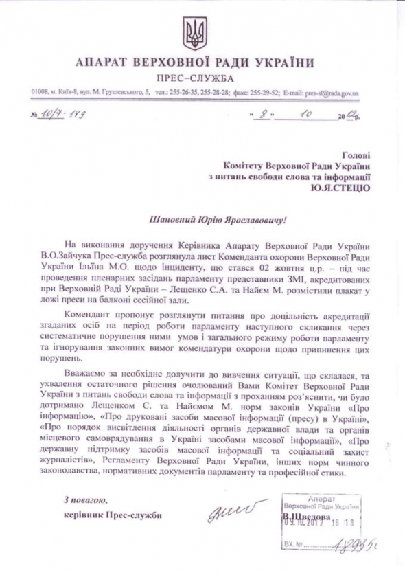 Пресс-служба Аппарата Верховной Рады направила в комитет по вопросам свободы слова и информации письмо с просьбой рассмотреть целесообразность предоставления аккредитации в парламенте журналистам Мустафе Найему и Сергею Лещенко.