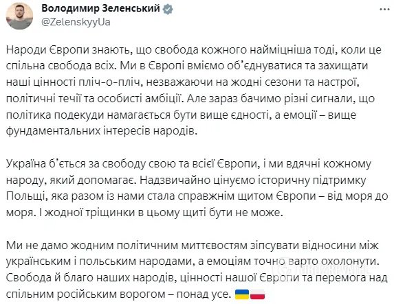 "Мы не дадим никаким политическим мгновениям испортить отношения между украинским и польским народами, а эмоциям точно стоит остыть. Свобода и благо наших народов, ценности нашей Европы и победа над общим российским врагом – превыше всего", – сказал Зеленский.