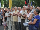 Лестницы на нее нет. Вместо нее положили перевернутый мусорник и бетонную вазу. На вече собралось около полтысячи человек. Преимущественно пожилых людей. Молодых почти не было. Началось вече с молитвы. Ее исполнил под фонограмму певец Теодор Кукуруза.