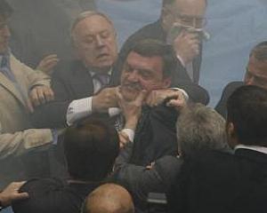 Спикеру парламента Владимиру Литвину пришлось укрываться от них под зонтами. Позже в зале сработали несколько дымовых шашек, а между депутатами от коалиции и оппозиции возникали драки.