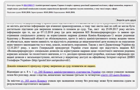 Генеральная прокуратура пропустила сроки обращения в суд относительно незаконной лицензии коммунального предприятия "Волыньприродресурс", из-за чего Украина потеряла возможность вернуть права на разработку четырех янтарных месторождений в Волынской области.