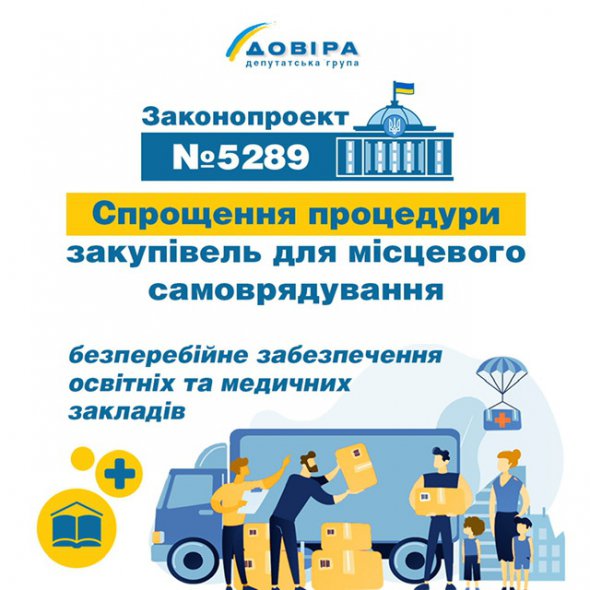 Представители депутатской группы "Довира" и нардепы из других фракций и групп зарегистрировали законопроект №5289 "О внесении изменений в статью 3 Закона Украины "О публичных закупках" относительно упрощения организации и проведения процедур закупок сельскими, поселковыми советами, городскими территориальными общинами".